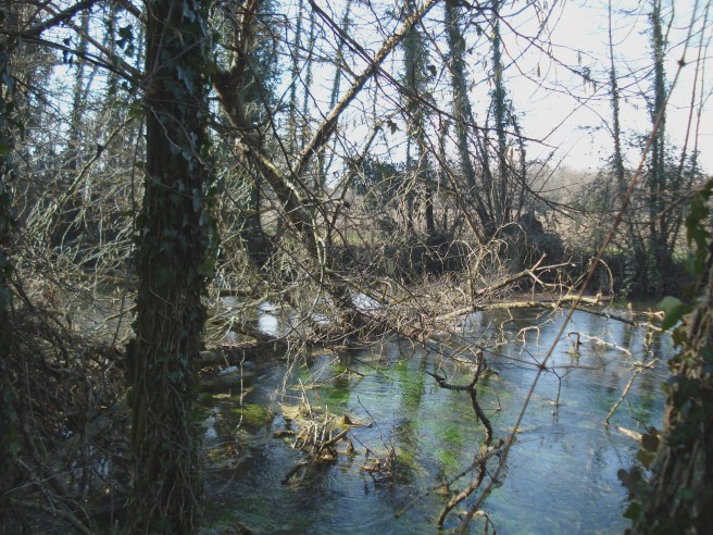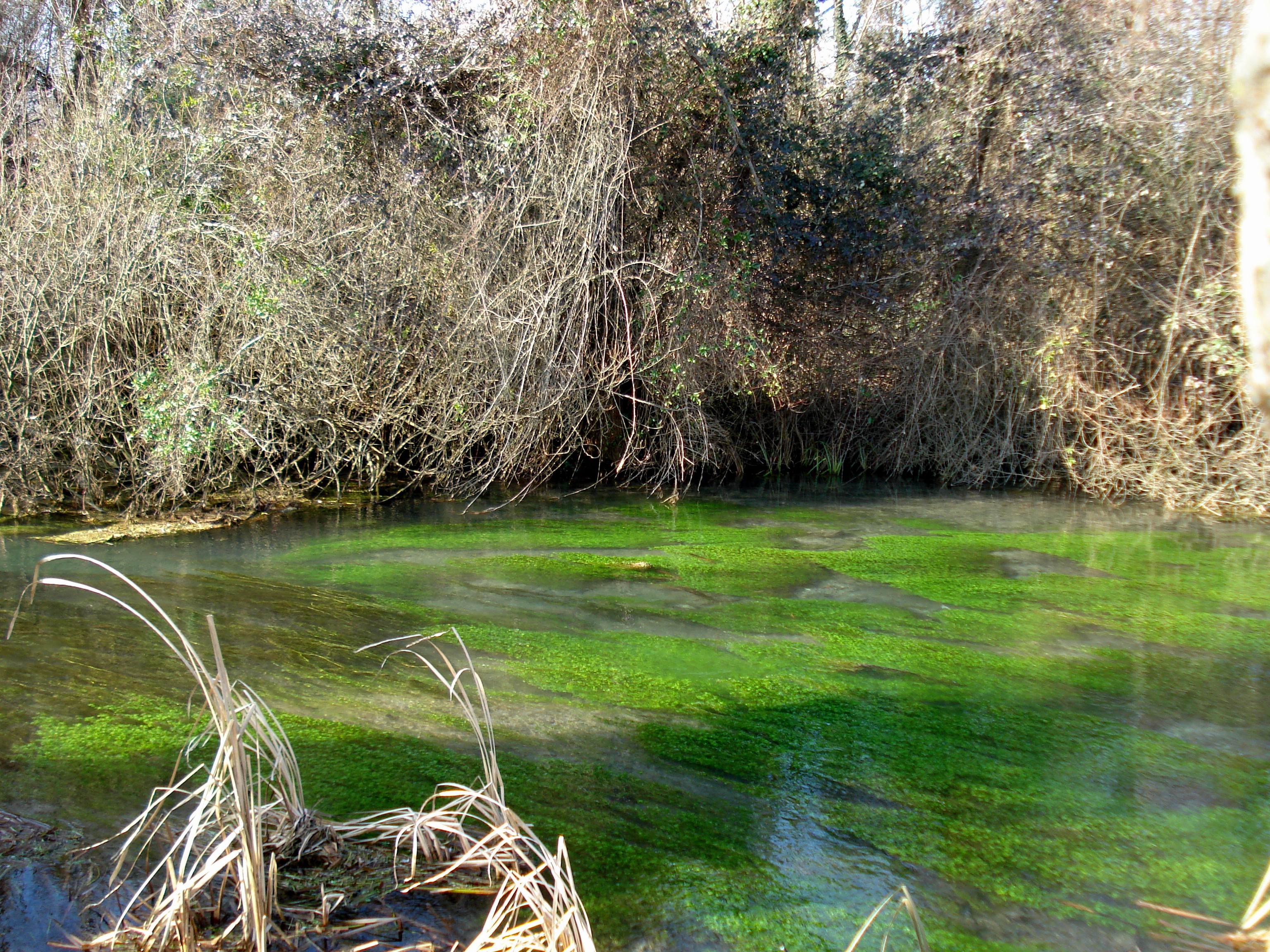 Nell’inverno il colore smorto della vegetazione aerea fa risaltare il verde smagliante delle erbe d’acqua.