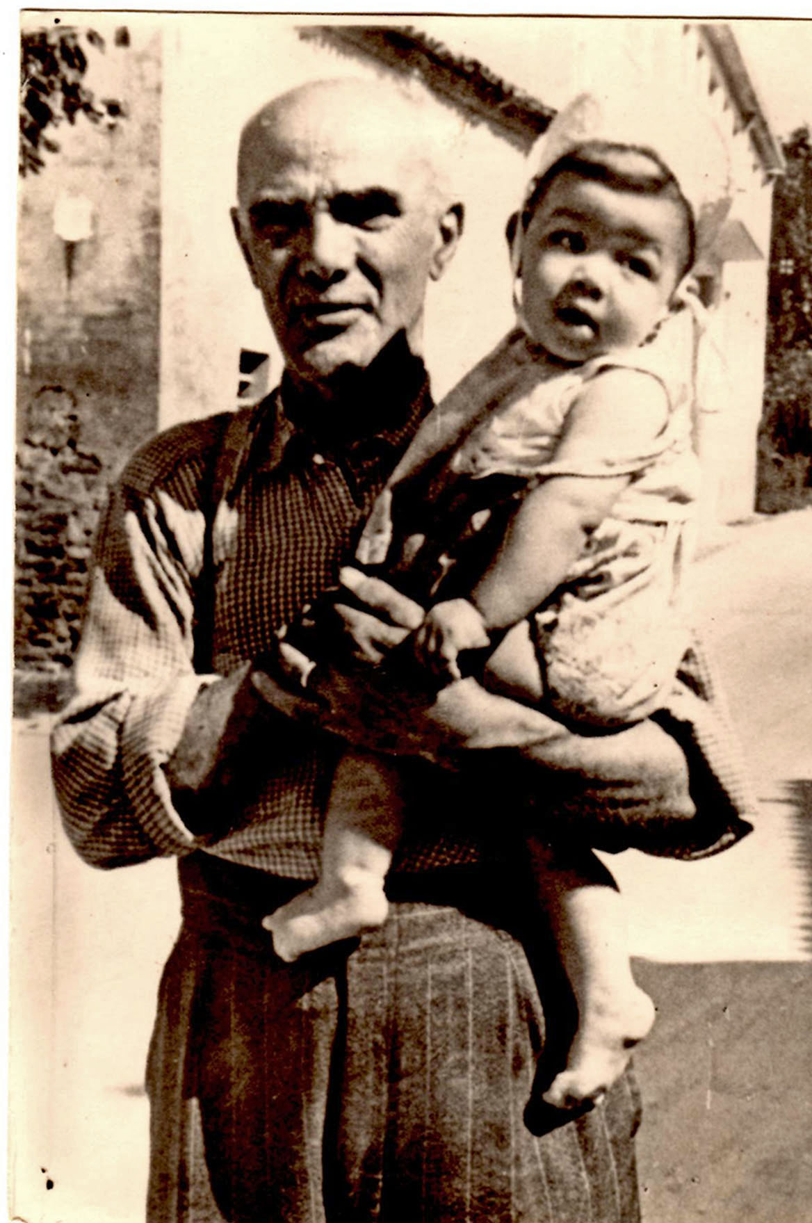 In questa foto del 1951 sono in braccio a mio nonno paterno, Elpino. Il nome viene da un personaggio dell’Aminta di Tasso. Mia nonna Bianca era già morta, a quell’epoca, e io del nonno non ho alcun ricordo, perché morì pochi mesi dopo. Ebbe due figli e tre figlie: Cira, Elisa, Nino (mio padre), Norma e Tomaso (con una m sola). Erano stati agiati commercianti, i Brotto di Zero Branco, in provincia di Treviso, dove io nacqui e vissi per pochissimo tempo, prima che i miei genitori andassero a vivere a Venezia. All’inizio del Novecento avevano un emporio che vendeva di tutto, dal sapone ai fucili da caccia, come nel vecchio West. La crisi del Ventinove privò la famiglia della sua ricchezza. Non più servitori né cavalli, e mio nonno in età avanzata finì impiegato. Fascista della prima ora, fu anche podestà del paese. Nella foto si intravede la vecchia casa dei Brotto, costruita nel Settecento, in una stanza della quale sono venuto al mondo, trattovi di forza dal medico condotto, col forcipe di metallo. Qualche anno fa quella casa è stata rasa al suolo, insieme ai suoi soffitti ornati di stucchi, e al suo posto è sorta una costruzione in stile falso-veneto. Nel luogo dove sono nato ora c’è un bar.