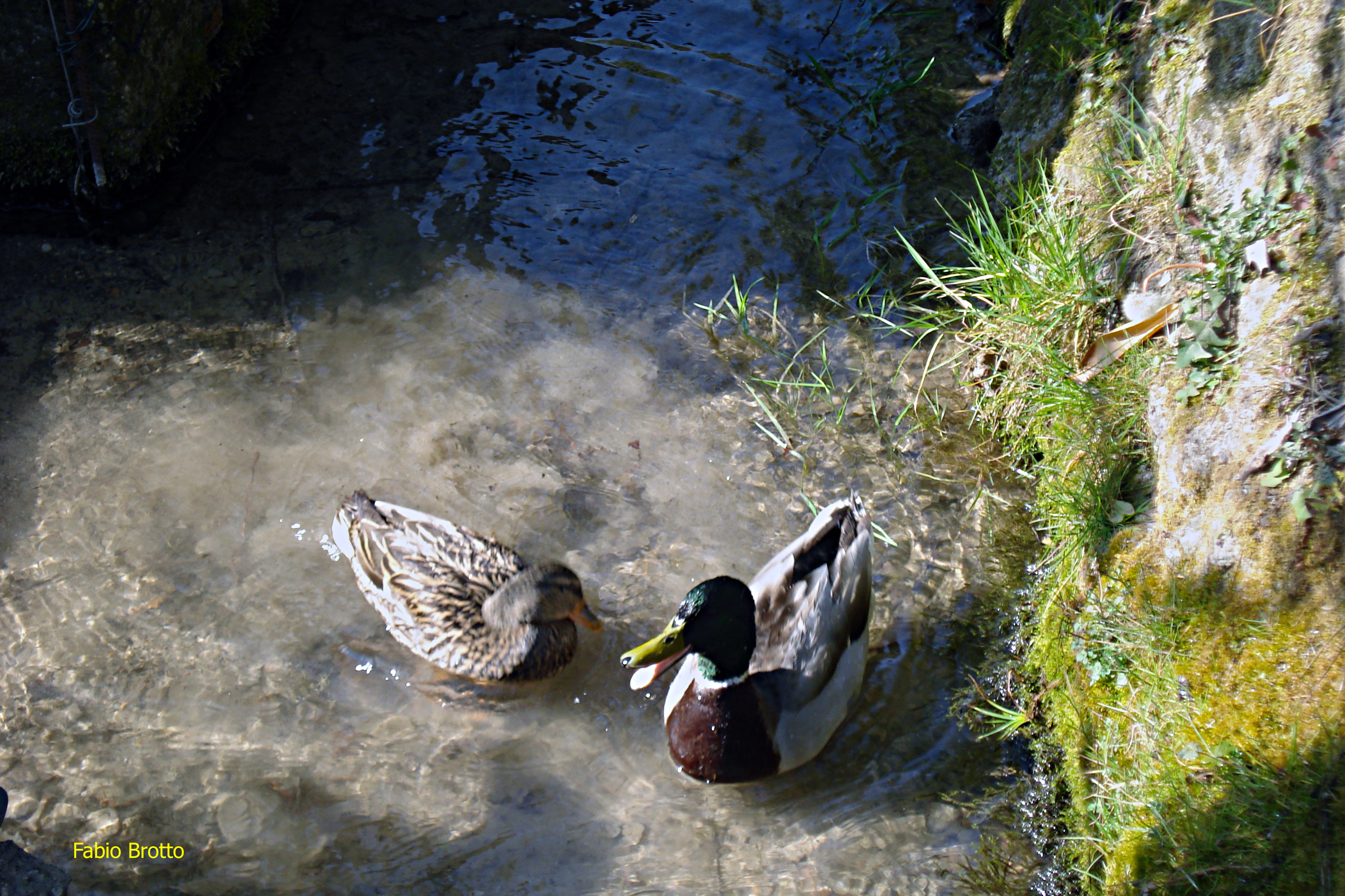 Intorno a casa mia i germani reali proliferano. Basta che ci sia un po’ d’acqua. Nel cielo di Treviso volano come piccioni. Attraversano le strade asfaltate con calma, e se qualcuno finisce sotto un’auto la specie non ne soffre: il clima cittadino consente più di una covata l’anno, e i predatori sono quasi assenti. Quasi, perché qui in periferia, nella semi-campagna in cui vivo, qualche volpe si aggira nella notte. Aprendo il cancello per uscire con l’auto mi capita talvolta di vedere in mezzo alla stradina una coppietta di palmipedi a passeggio. Al confine del mio orticello c’è una polla d’acqua, e anche lì si può vedere ogni tanto qualche anatra selvatica cittadina, come questi due germani, maschio e femmina,  tranquilli e beati.