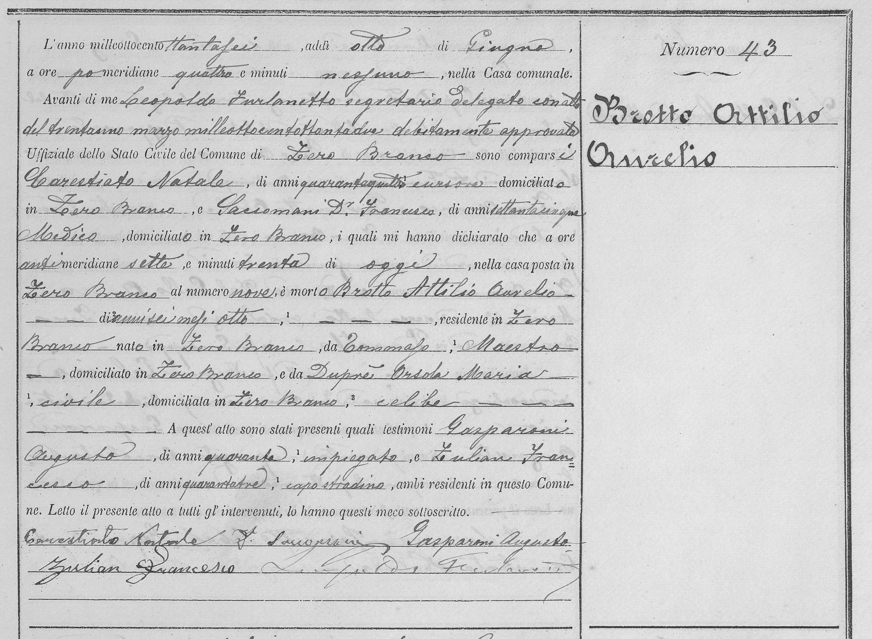 Aveva solo sei anni e otto mesi quando morì, Attilio Aurelio Brotto, figlio del mio bisnonno Tomaso e di Orsola Maria Duprè. Fino all’altro giorno non sapevo che un mio prozio fosse morto bambino, nel lontano 1886. Nell’Ottocento la morte di un bambino era un evento frequentissimo, il tema della culla vuota un triste tema ricorrente. Denutrizione delle masse contadine, scarsa igiene, assenza quasi totale di strutture ospedaliere (e mezzi di trasporto lenti), Welfare State inesistente, e mancanza di farmaci che noi oggi diamo per scontati, come gli antibiotici, facevano della nascita un rischio grave per madre e bambino, e dei primi anni di vita un periodo molto difficile. Sono cose risapute, ma quando ho letto gli atti di morte di un paese come il mio natale (Zero Branco in provincia di Treviso) nel tentativo di ricostruire l’albero genealogico della mia famiglia, e ho passato in rassegna gli anni Settanta e Ottanta dell’Ottocento, sono rimasto molto colpito. Quanti bambini di pochi mesi o anni morivano in quel tempo! Un numero impressionante. E se Tomaso e Orsola persero quel figlio di sei anni (non oso immaginare le sofferenze), il fratello Enrico Brotto e sua moglie Bianca Sagramora furono molto più duramente colpiti dal destino: nel 1874 muore la figlioletta Luigia, all’età di 10 mesi; nel 1877 muore Luigia Angelina, all’età di due anni e cinque mesi; nel 1879 il figlioletto Luigi, all’età di otto mesi. Sono anche gli anni della tremenda epidemia di difterite, alla quale Carducci dedica l’ode barbara Mors. Non ci sono parole per commentare una simile strage di innocenti. Allora non c’era né antibiotico né vaccino. Ed essere, come era Enrico, un possidente non metteva al sicuro i tuoi figli. Tristezza di piccole tombe scomparse, di nomi svaniti nel nulla.