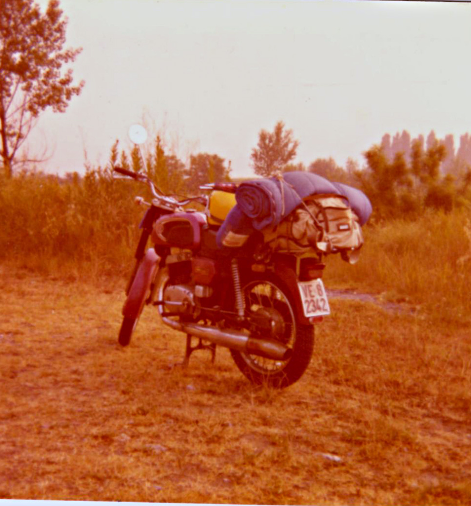 Da buon veneziano, presi la patente tardi, nel 1975, a 24 anni. E il mio primo mezzo di trasporto fu una moto, quella che si vede in questa foto, scattata con una Kodak Instamatic nel luglio del 1976: una CZ cecoslovacca, la moto più economica che allora si potesse acquistare in Italia. Non potevo viaggiare in autostrada, perché aveva solo 125 cc di cilindrata. Bicilindrica a miscela, rumorosa e abbastanza puzzolente. Le scattai questa foto durante una sosta dalle parti di Ferrara. Ero partito all’alba alla volta dell’Argentario, da solo e con la moto stracarica (tenda canadese, materassino gonfiabile, sacco a pelo, ecc.). Feci il passo di Raticosa. Arrivai verso sera alla meta, col sedere indolenzito. L’anno dopo mi comprai una Fiat 126, e passai la moto a mio fratello, che non la trattò molto bene, sicché ebbe breve vita, poveretta.
