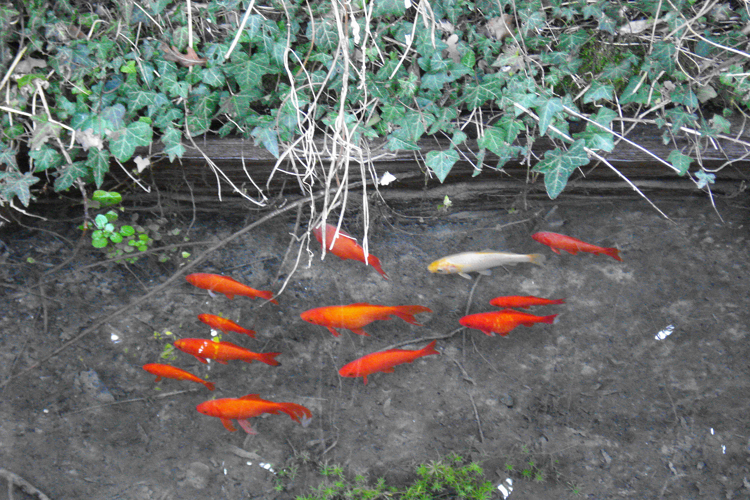 Rivoli, rivoletti, canaletti, fiumiciattoli. Vicino a casa mia c’è anche una Via delle acquette. Prima del dilagare del cemento in queste acque vivevano i gamberi di fiume. La gente libera i carassi, che riprendono la vita di un tempo, e dopo qualche generazione non saranno più rossi, avrannno ripreso la livrea originaria. In questo gruppetto che nuota pigramente nella fredda lenta corrente invernale c’è un diverso. Ma i carassi non fan caso al colore delle squame.