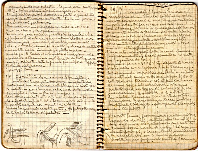 20 ottobre 1943. Stamane siamo stati al solito appello biquotidiano. Mario s’è dato da fare per trovare il sale per cuocere il gatto che abbiamo ucciso ieri. Ora è a bagno. Speriamo venga fuori qualche cosa di buono. Ci leviamo di bocca quella specie di burro che ci danno alla sera per condire il gatto. Ho sentito da quel capitano dei granatieri che parla col megafono le spettanze. Credo si dovrebbe tirare meno la cinghia se andasse tutto dentro le pentole.