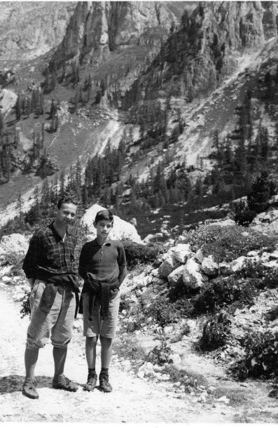 Quasi mezzo secolo è passato dal momento fermato in questa fotografia dell’agosto 1963, in cui sono con mio padre dalle parti di Caviola: avevo 12 anni e fatto la seconda media. L’anno dopo avremmo preso in affitto a Cortina d’Ampezzo un appartamento il cui proprietario era un falegname ottantenne, Antonio Caldara, che aveva appreso l’arte sotto il governo imperial-regio. A volte gioco mentalmente col tempo, e penso cose di questo genere: che 49 anni prima del 1964 era il 1915, e dunque quell’anno sta in mezzo tra questi due punti, è tanto lontano dal mio presente di oggi quanto l’entrata dell’Italia nella Grande Guerra dall’altro versante. Oppure penso cose di questo genere: che io ho conosciuto persone che nell’anno del Signore 1900 avevano 18 anni, e a loro volta avevano conosciuto persone nate nel 1810, in pieno regime napoleonico. E sempre un brivido mi coglie, sempre di nuovo.